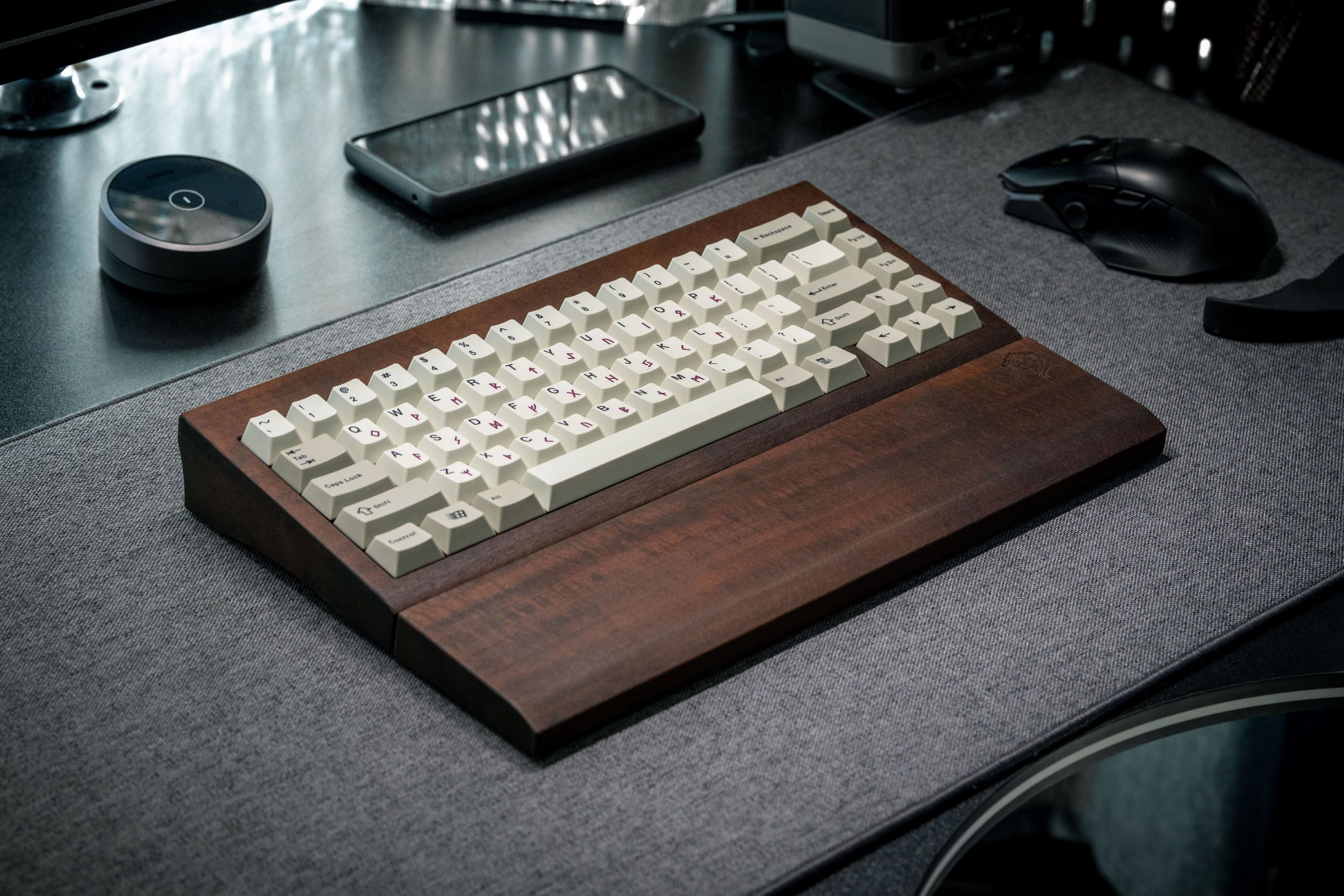 After many trials and tribulations, we have arrived at the current iteration of the gwŷdd65 keyboard: a 65% gasket-mount keyboard made of pure wood.